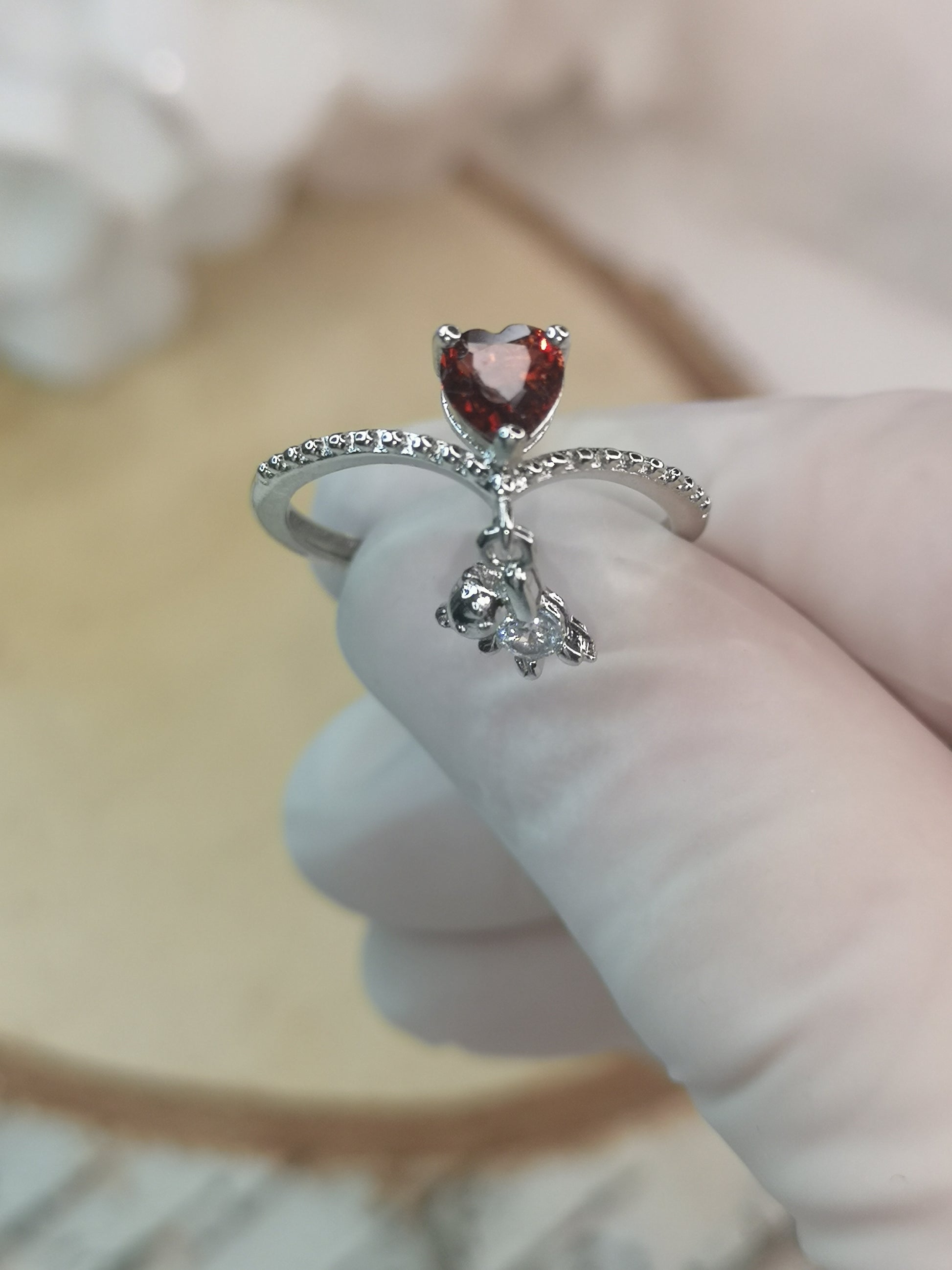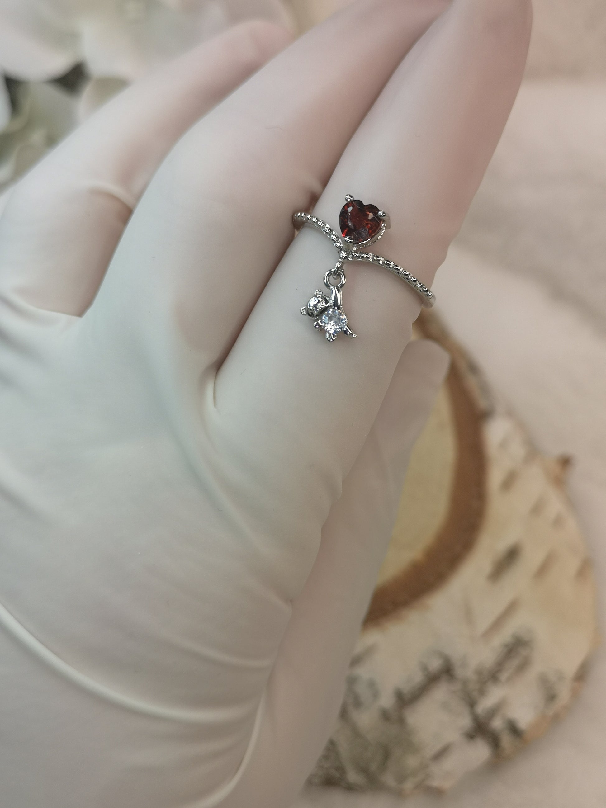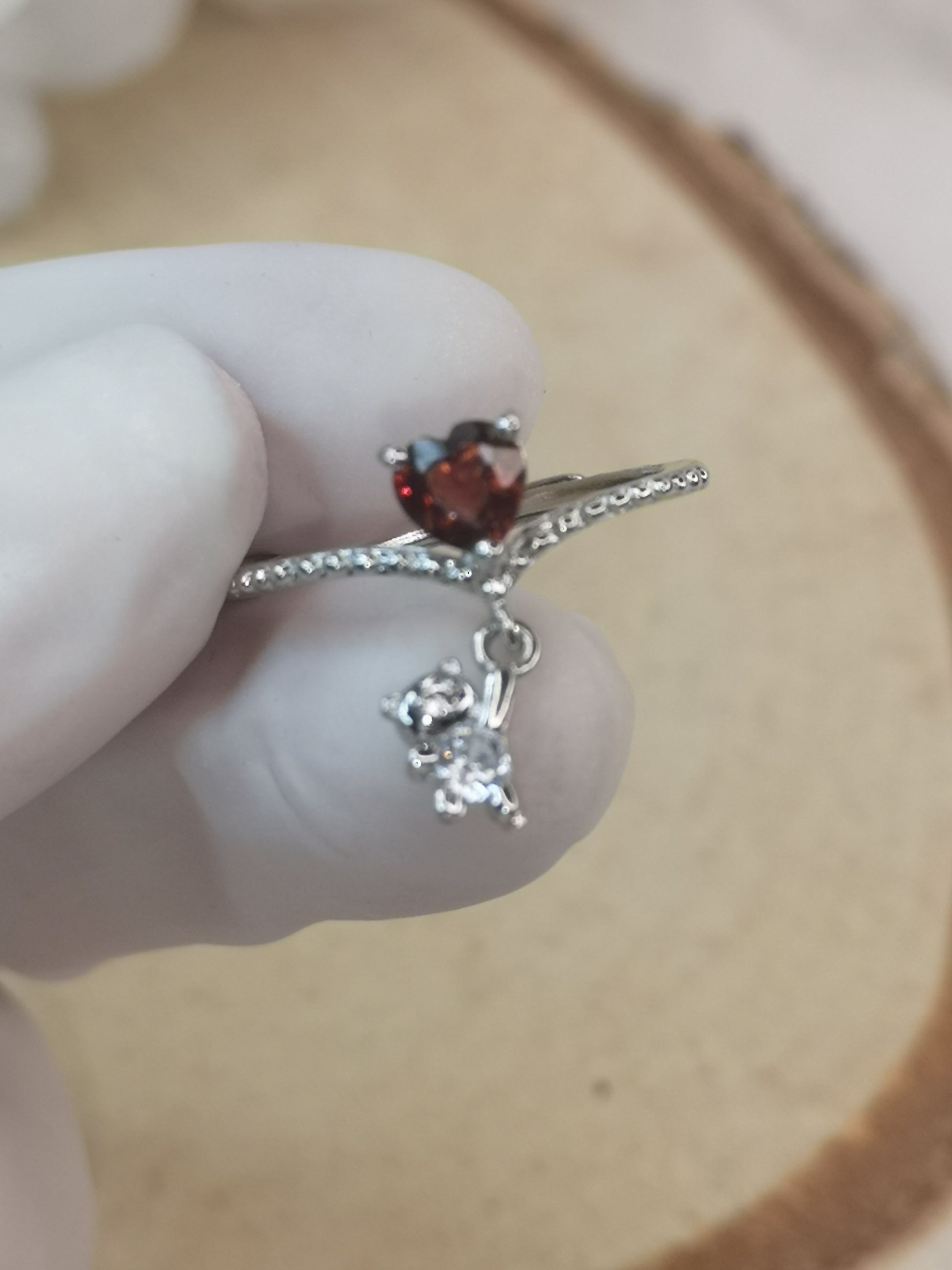 Herz Teddybär Granat Edelstein Kupfer Ring, verstellbar